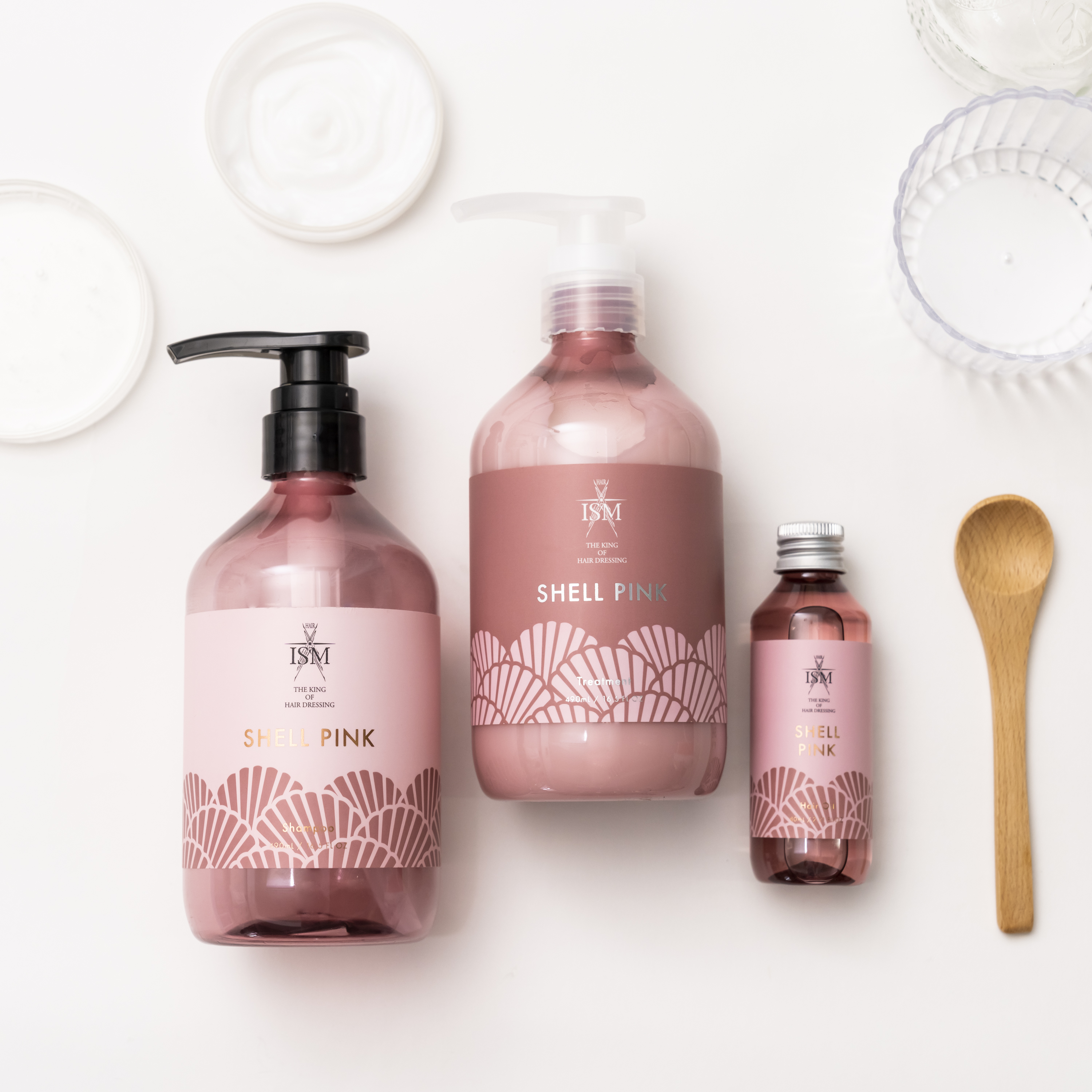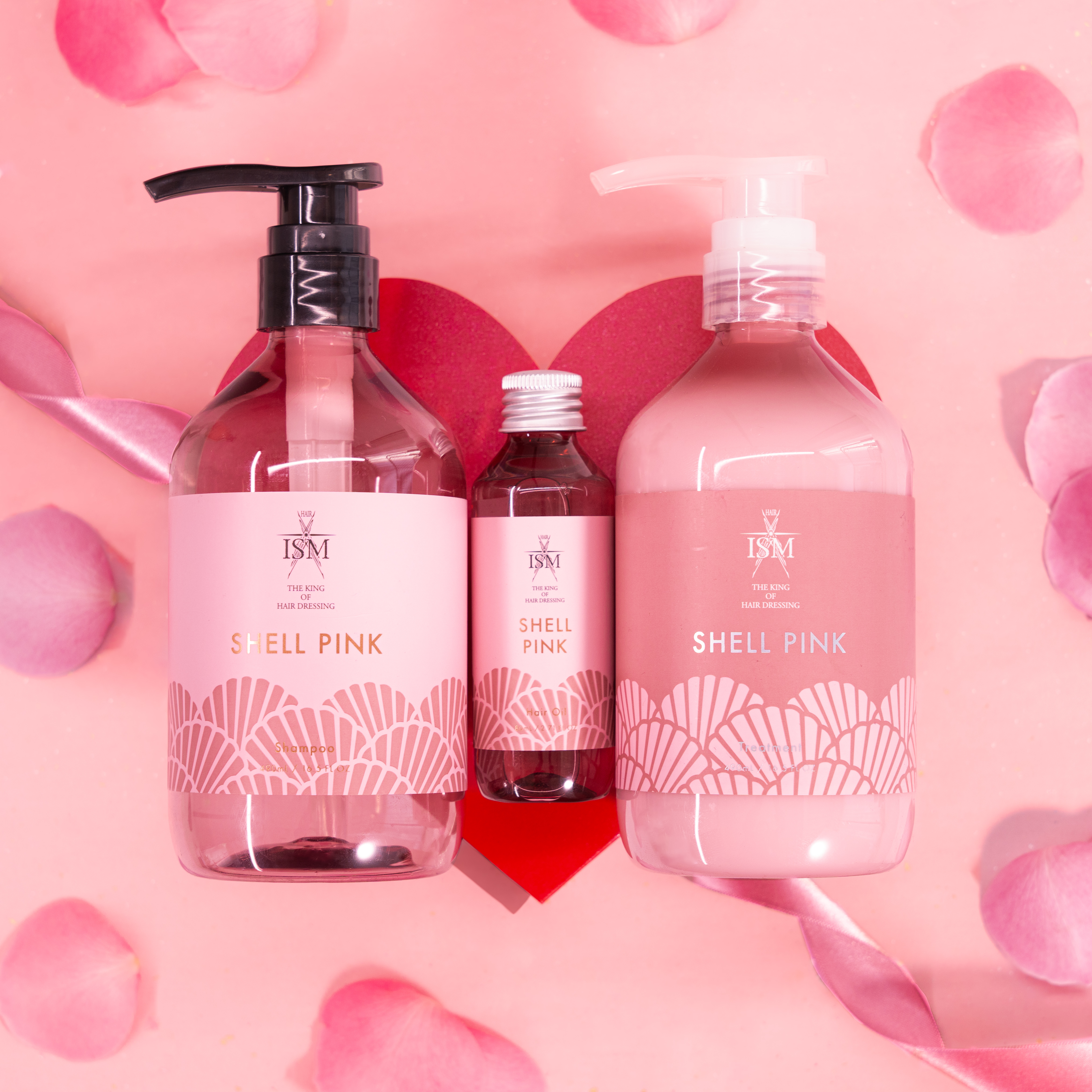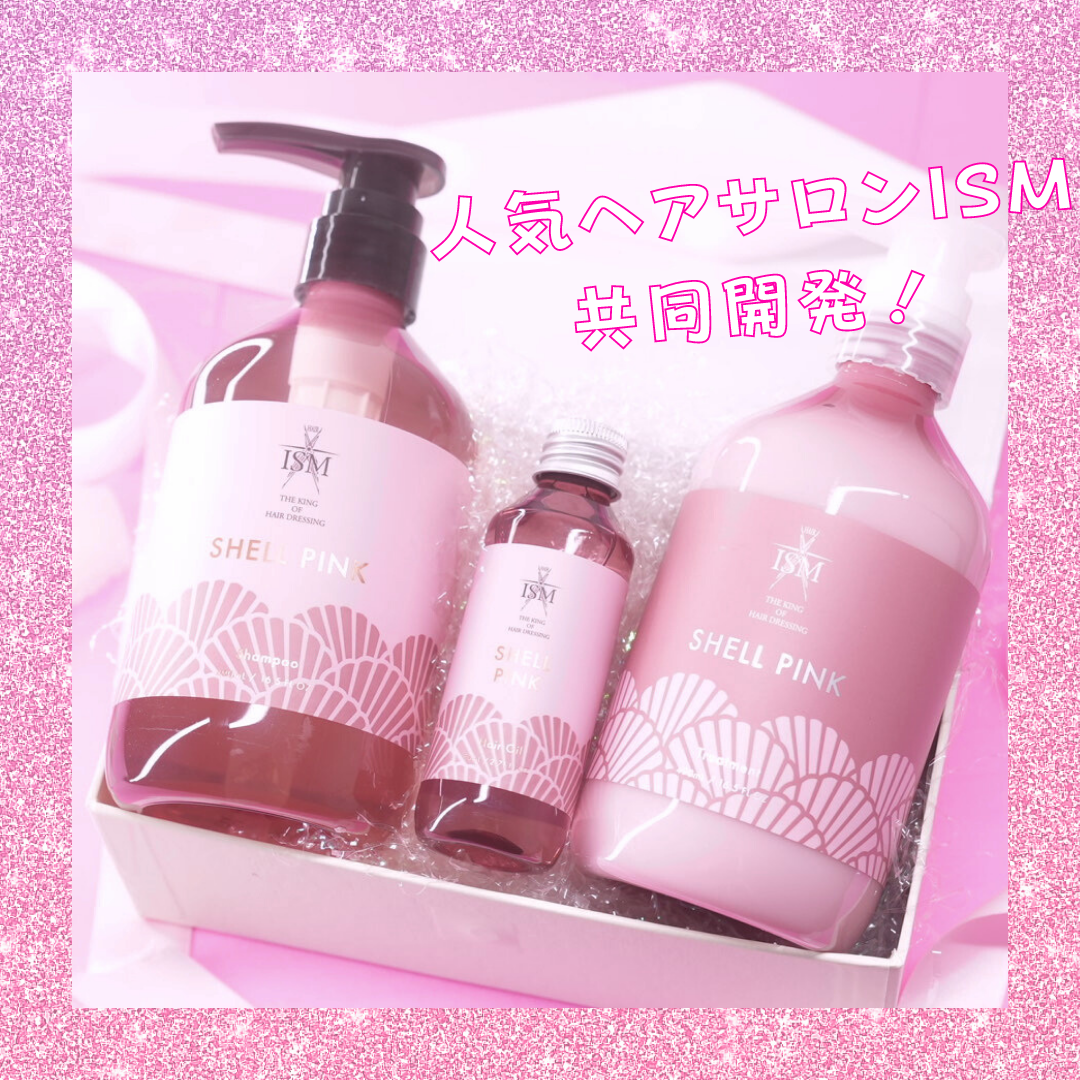 シェルピンクのシャンプー&トリートメント&ヘアオイルの3点セットです。